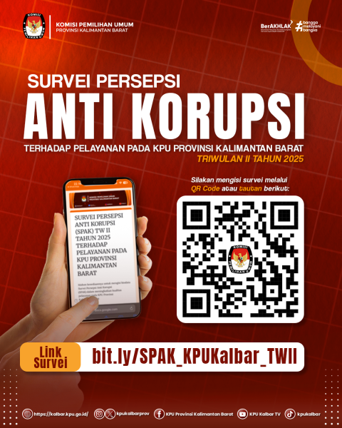 kalbar.kpu.go.id - Pontianak, dalam rangka meningkatkan kualitas pelayanan publik yang bersih, transparan, dan akuntabel, KPU Provinsi Kalimantan Barat mengajak seluruh masyarakat untuk berpartisipasi dalam Survei Persepsi Anti Korupsi (SPAK) Triwulan II Tahun 2025.