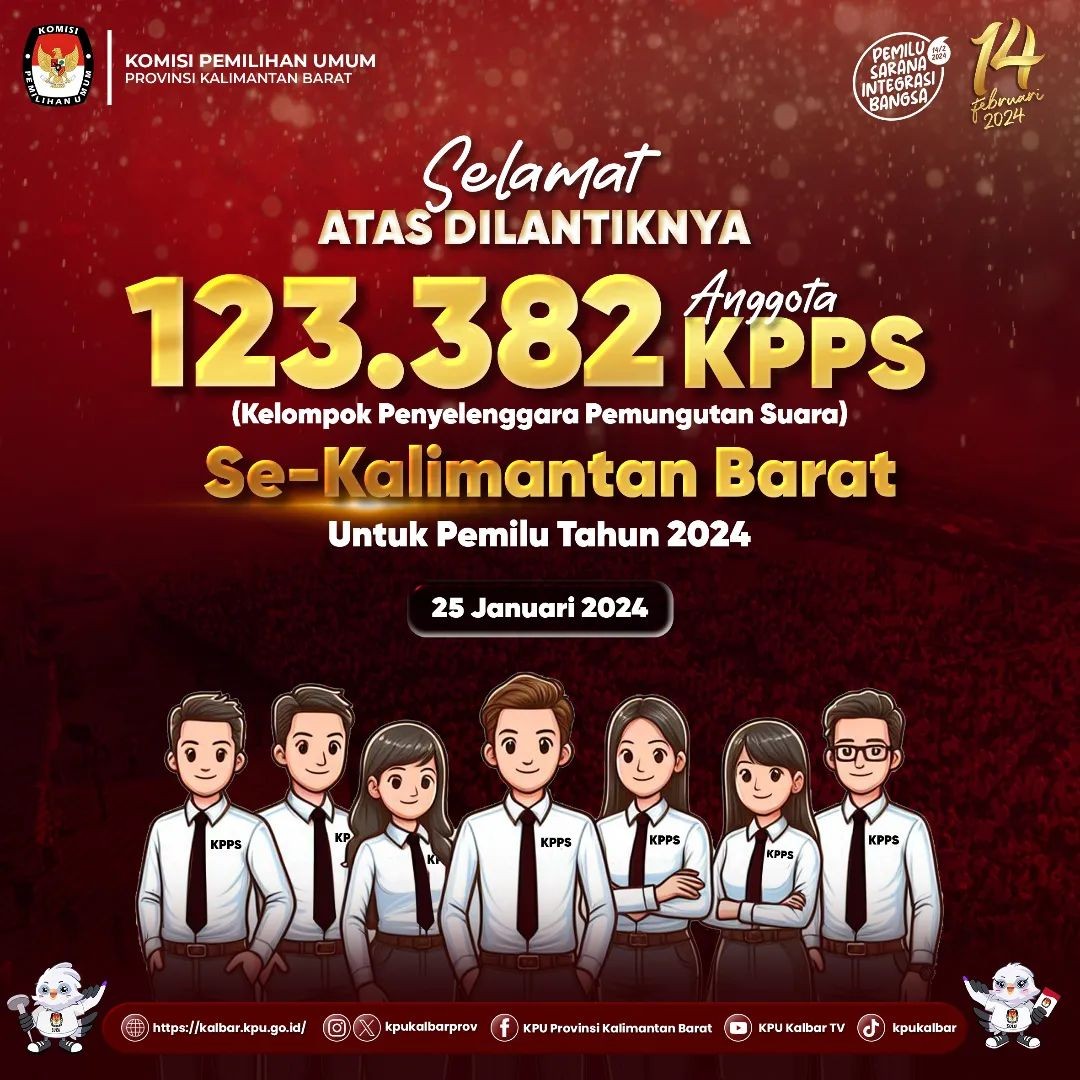kalbar.kpu,go.id - Pontianak, Menjelang penyelenggaraan Pemilihan Umum Serentak Tahun 2024, sejumlah 123.382 Anggota Kelompok Penyelenggara Pemungutan Suara (KPPS) se-Kalimantan Barat dilantik secara serentak di masing-masing Kabupaten/Kota, Kamis (25/1).