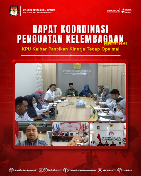 kalbar.kpu.go.id - Pontianak, KPU Provinsi Kalimantan Barat menggelar Rapat Koordinasi Penguatan Kelembagaan pada Rabu, 29 Januari 2026, yang diikuti oleh KPU Kabupaten/Kota se-Kalimantan Barat melalui Zoom Meeting. Kegiatan ini menjadi forum koordinasi, berbagi informasi, serta penyamaan persepsi guna memastikan konsistensi dan optimalisasi kinerja seluruh jajaran, baik pada masa tahapan maupun di luar tahapan Pemilu. (adm)