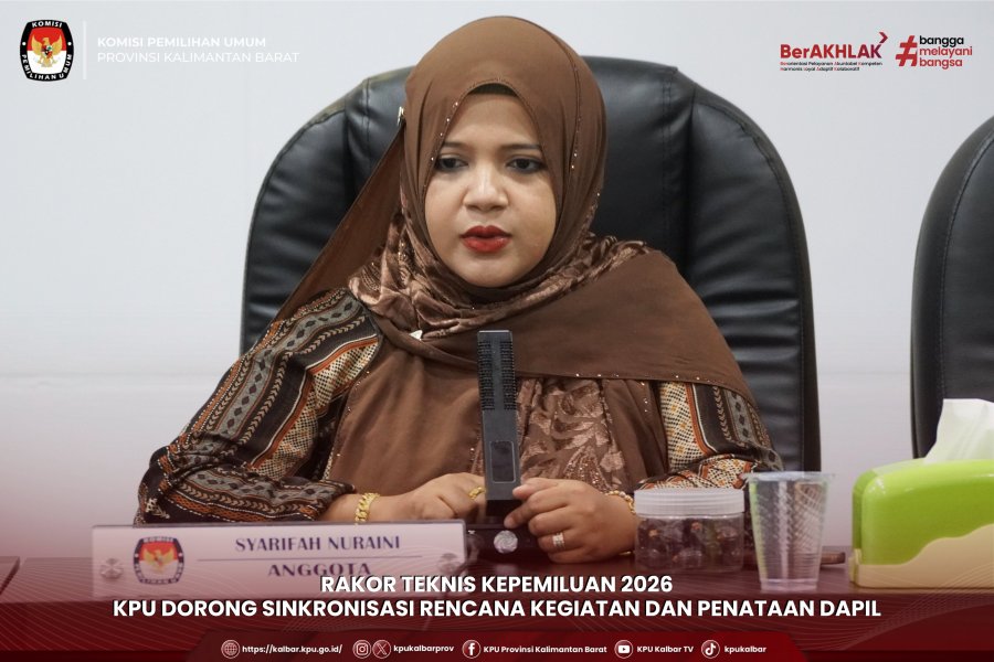 Hadir sebagai narasumber, Anggota KPU Provinsi Kalimantan Barat, Syarifah Nuraini yang menyampaikan pemaparan materi Rencana Kegiatan Divisi Teknis Penyelenggaraan Pemilu Tahun 2026 serta Penataan Daerah Pemilihan dan Alokasi Kursi.