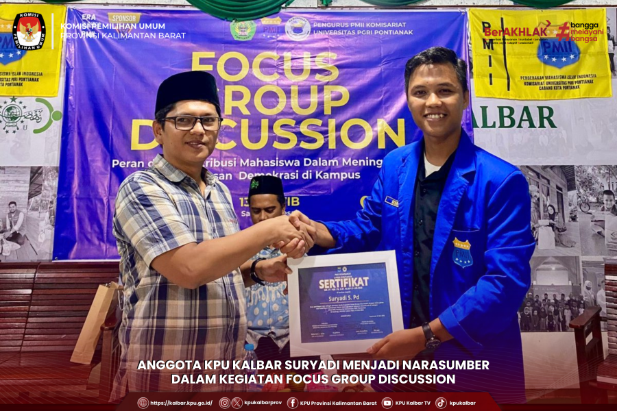 kalbar.kpu.go.id - Pontianak, Anggota KPU Kalbar Suryadi menjadi narasumber dalam kegiatan Focus Group Discussion dengan tema "Peran dan Kontribusi Mahasiswa dalam Meningkatkan Wawasan Demokrasi di Kampus" yang diselenggarakan oleh Pengurus Komisariat PMII UPGRI Pontianak, bertempat di Balai NU Kalbar, Sabtu (10/5). (adm)