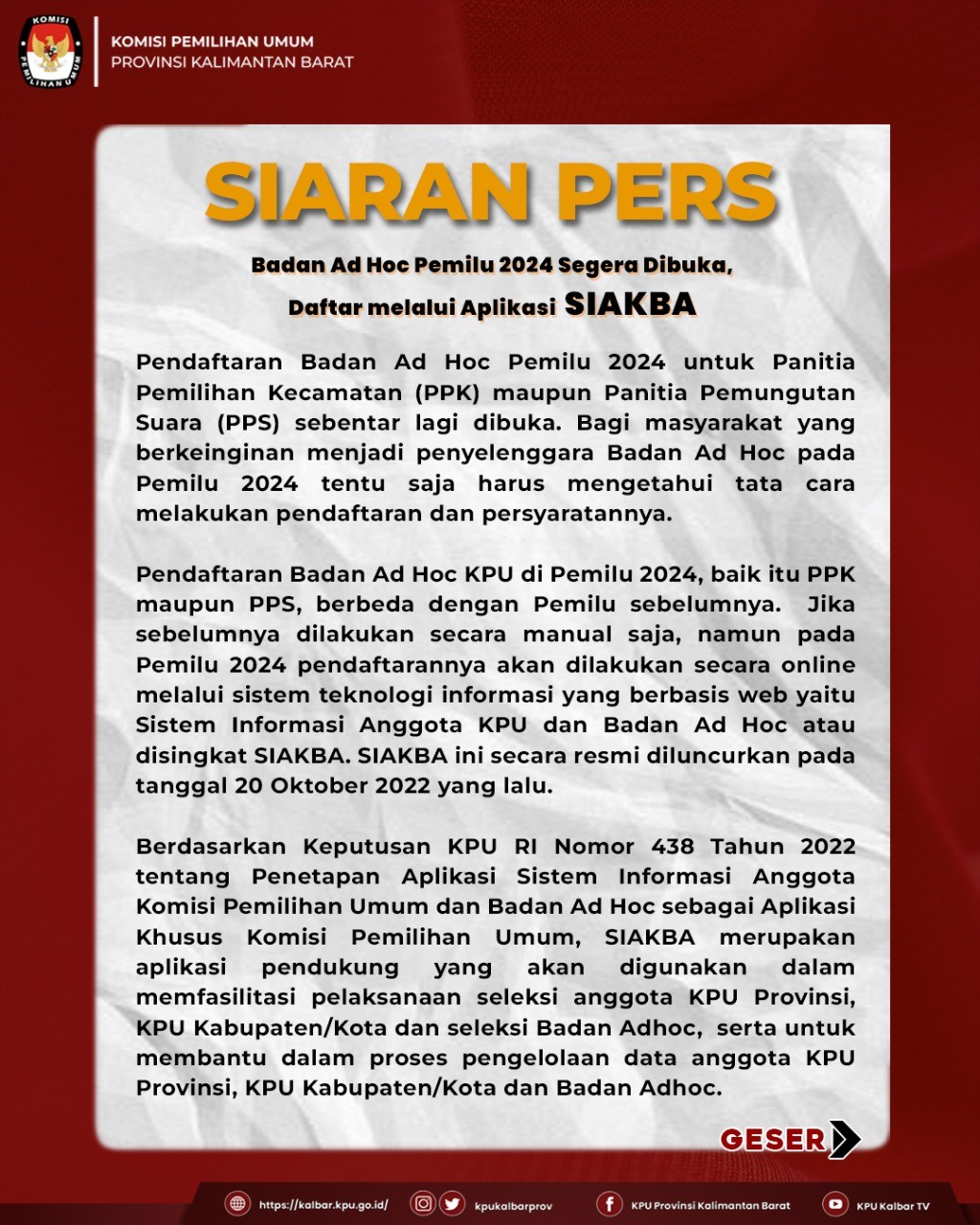 Pendaftaran Badan Ad Hoc KPU di Pemilu 2024, baik itu PPK maupun PPS, berbeda dengan Pemilu sebelumnya. Jika sebelumnya dilakukan secara manual saja, namun pada Pemilu 2024 pendaftarannya akan dilakukan secara online melalui sistem teknologi informasi yang berbasis web yaitu Sistem Informasi Anggota KPU dan Badan Ad Hoc atau disingkat SIAKBA. SIAKBA ini secara resmi diluncurkan pada tanggal 20 Oktober 2022 yang lalu.