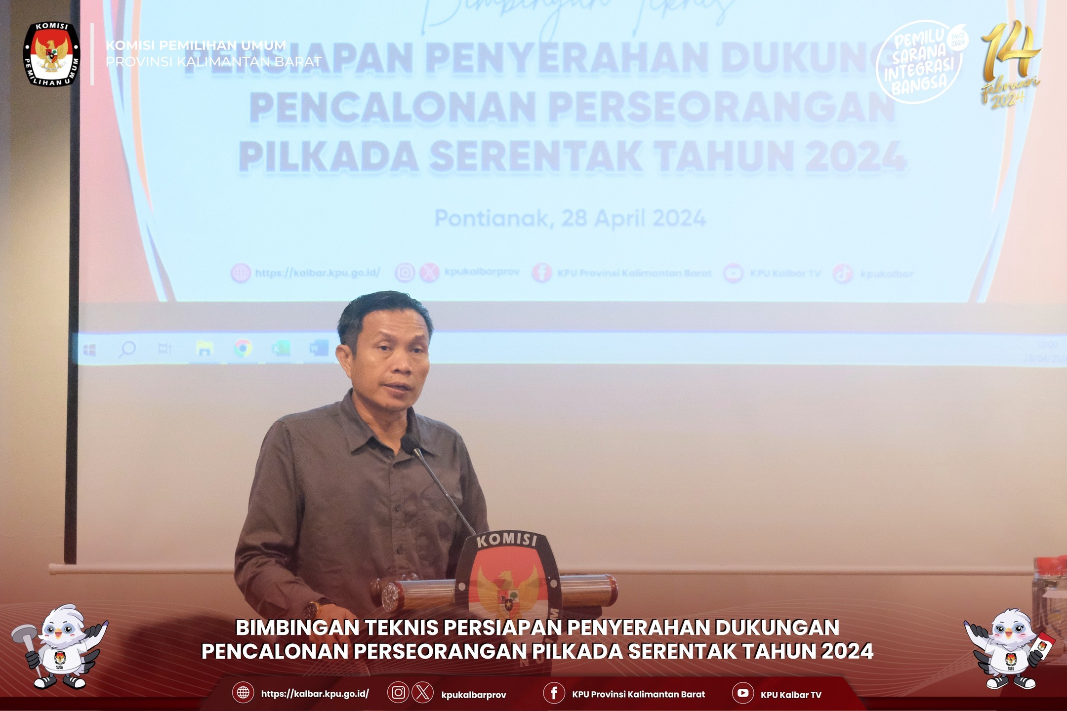 kalbar.kpu.go.id - Pontianak, KPU Kalbar melaksanakan Bimbingan Teknis Persiapan Penyerahan Dukungan Pencalonan Perseorangan Pilkada Serentak Tahun 2024, bertempat di Hotel Mercure Pontianak, Minggu (28/4).