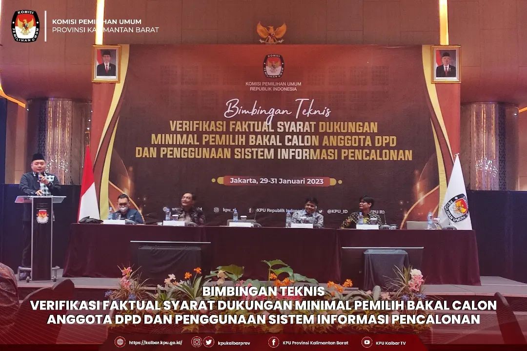 kalbar.kpu.go.id - Jakarta, KPU Kalbar mengikuti Bimbingan Teknis Verifikasi Faktual Syarat Dukungan Minimal Pemilih Bakal Calon Anggota DPD dan Penggunaan Sistem Informasi Pencalonan, Minggu-Selasa, 29-31 Januari 2023.