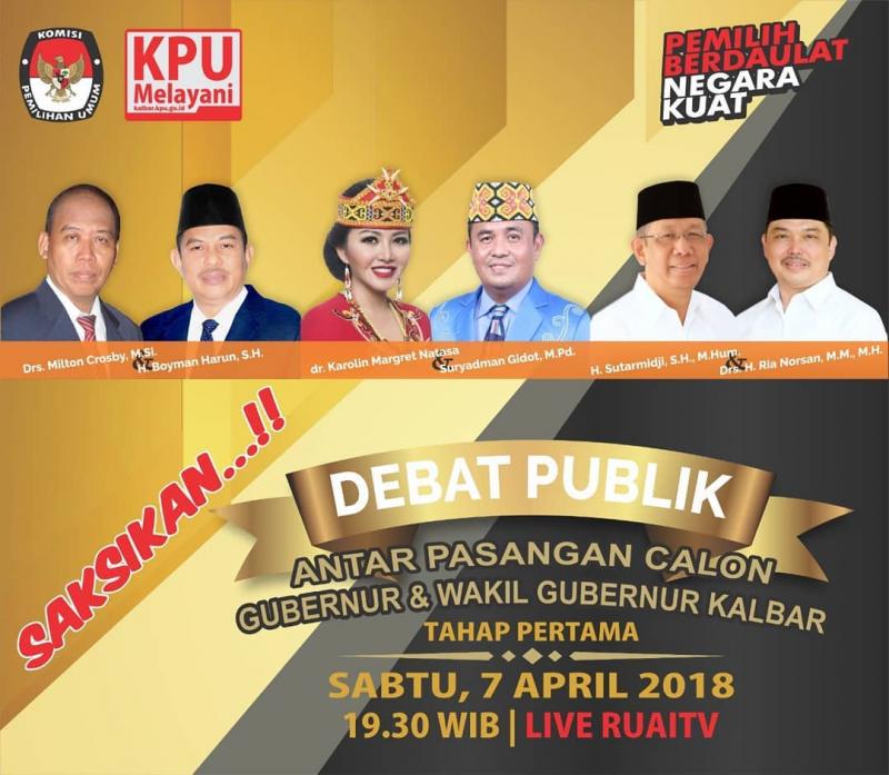 kalbar.kpu.go.id - Komisi Pemilihan Umum (KPU) Provinsi Kalimantan Barat selenggarakan Debat Publik Tahap Pertama dengan mengusung tema "Meningkatkan kesejahteraan Masyarakat dan Pelayanan Publik" bertempat di Hotel Kapuas Palace Pontianak, Sabtu(07/04).