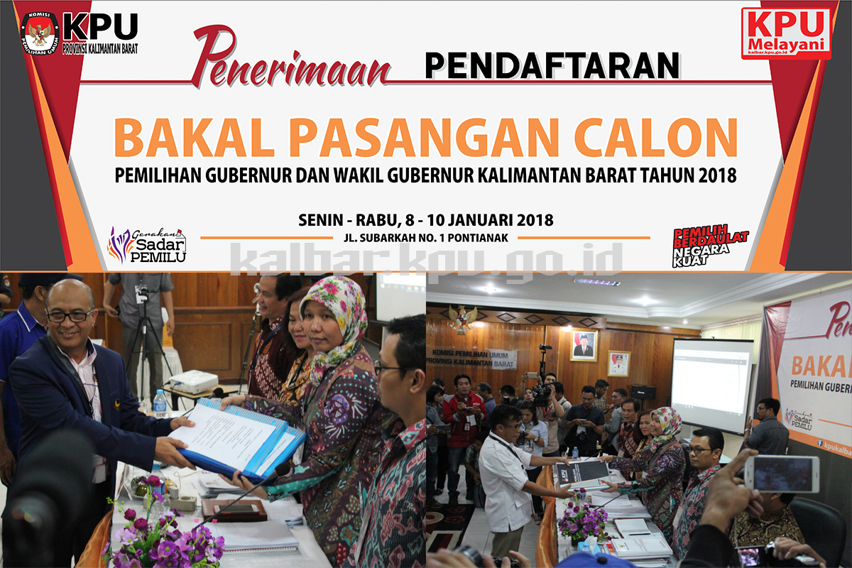kalbar.kpu.go.id - Pontianak, Pada hari pertama, Senin (8/1)terdapat dua bakal pasangan calon Gubernur dan Wakil Gubernur Kalimantan Barat mendaftar ke Komisi Pemilihan Umum (KPU) Provinsi Kalimantan Barat.