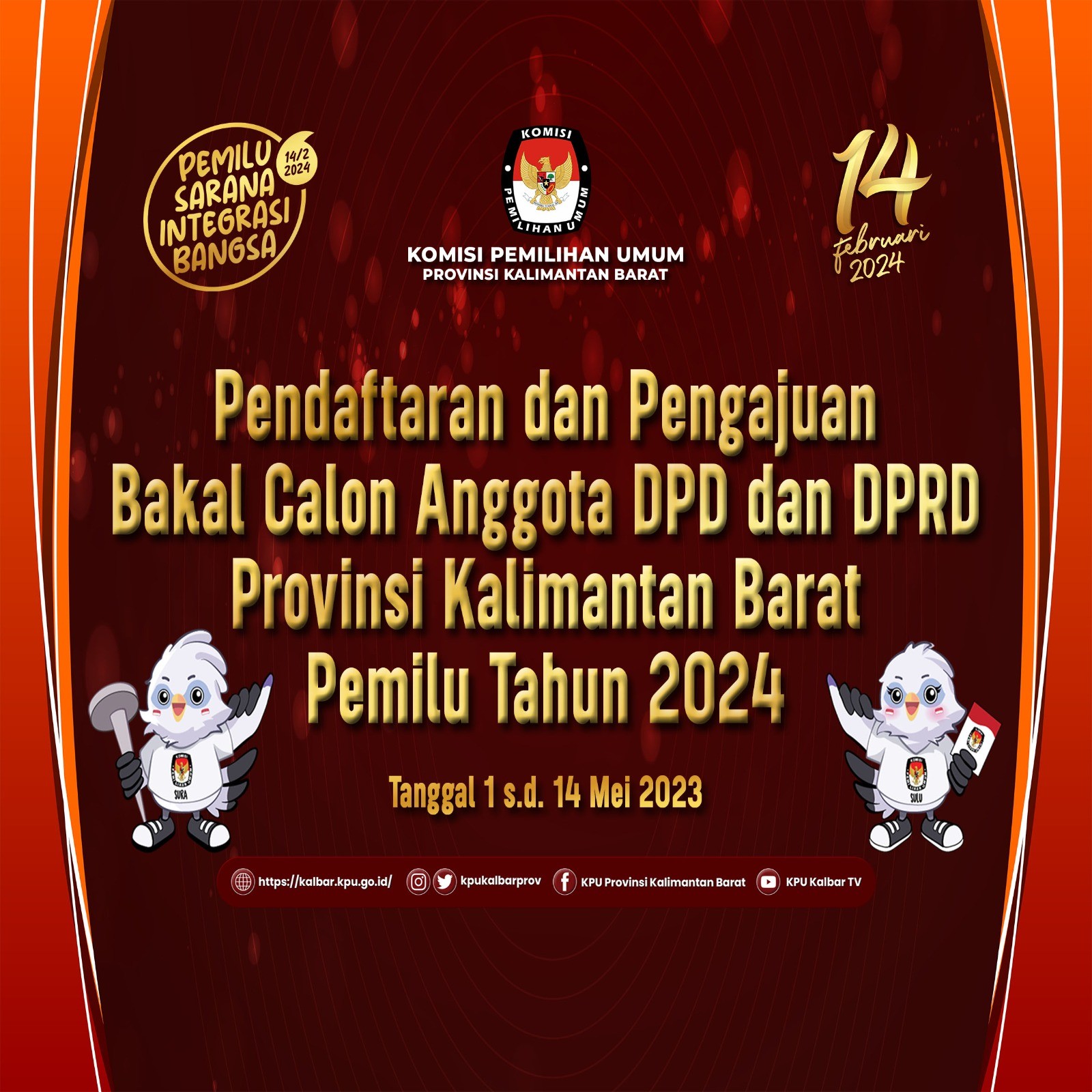 Sebagai informasi, Tahapan Pendaftaran Bakal Calon DPD dan Pengajuan Bakal Calon Anggota DPRD Provinsi Kalimantan Barat dilaksanakan sejak tanggal 1 Mei s.d. 14 Mei 2023. Untuk tanggal 1 Mei s.d. 13 Mei 2023, pendaftaran dan pengajuan dilaksanakan mulai pukul 08.00 WIB hingga 16.00 WIB, sedangankan untuk tanggal 14 Mei 2023, pendaftaran dan pengajuan dilaksanakan mulai pukul 08.00 WIB hingga 23.59 WIB.
