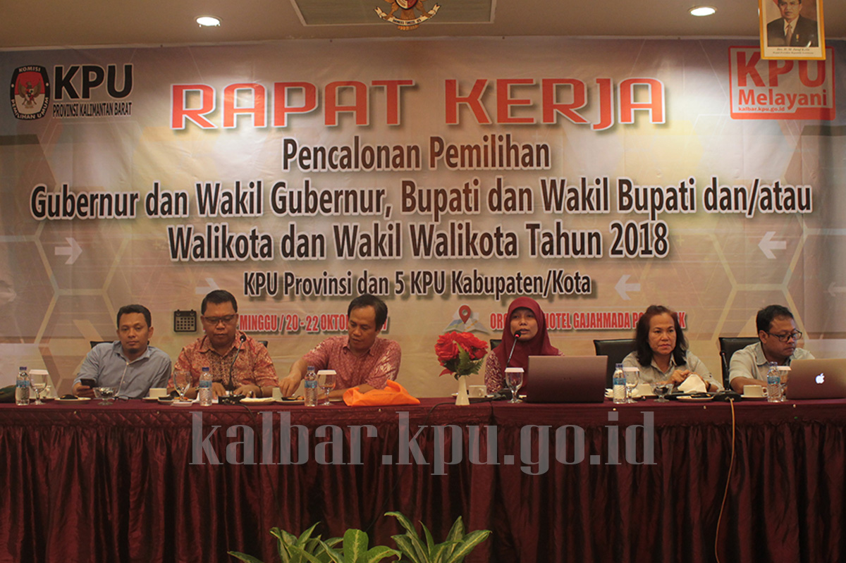 kalbar.kpu.go.id - Pontianak, Komisi Pemilihan Umum (KPU) Provinsi Kalimantan Barat menggelar Rapat Kerja Pencalonan Pemilihan Gubernur dan Wakil Gubernur, Bupati dan Wakil Bupati serta Walikota dan Wakil Walikota Tahun 2018 dengan 5 (lima) Kabupaten/Kota, bertempat di Orchardz hotel Gajahmada Pontianak pada 20 - 22 Oktober 2017.