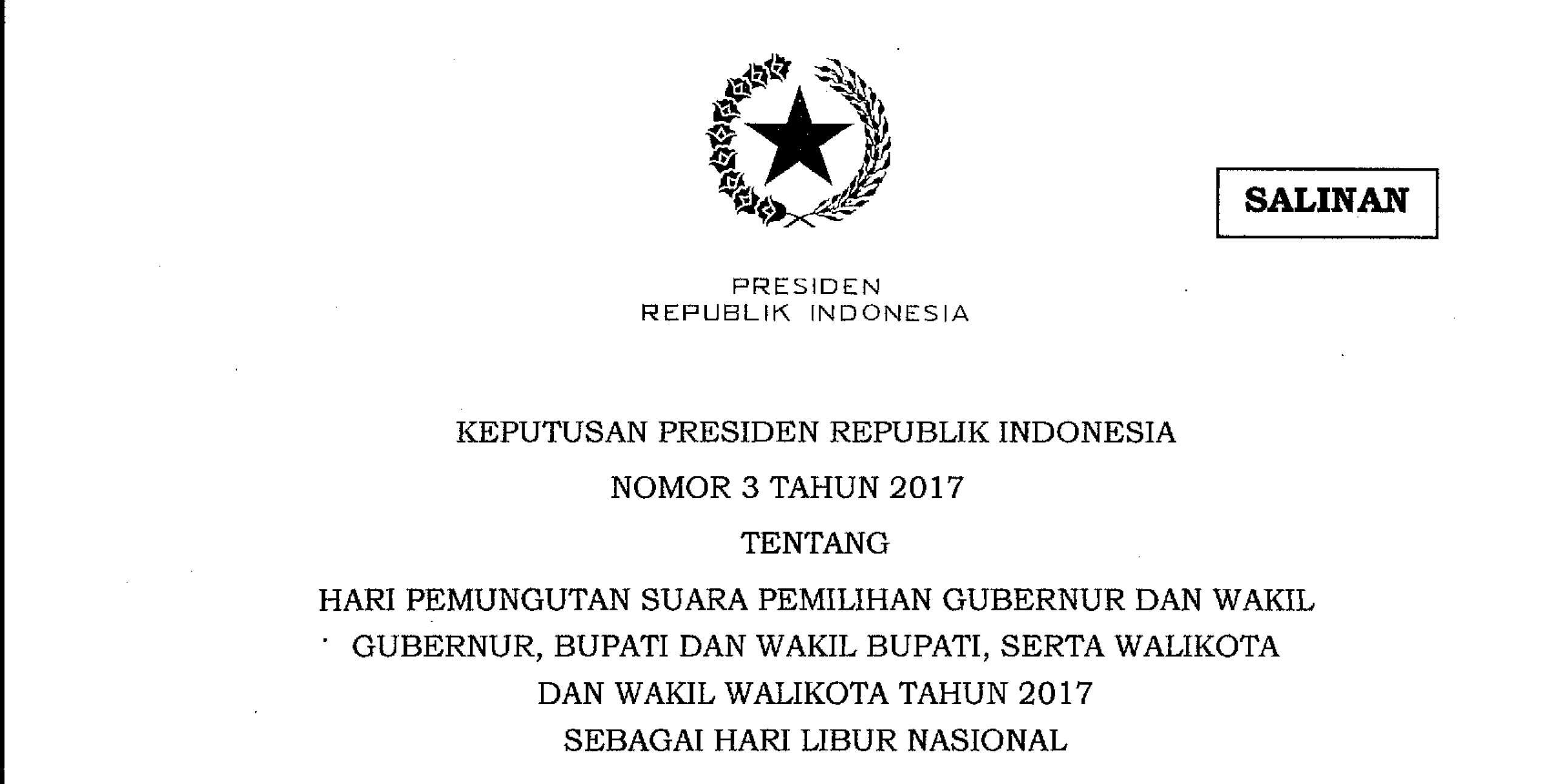 kpu-kalbarprov.go.id - Berikut disampaikan Keputusan Presiden RI Nomor 3 Tahun 2017 tentang Hari Pemungutan Suara Pemilihan Gubernur dan Wakil Gubernur, Bupati dan Wakil Bupati, Walikota dan Wakil Walikota Tahun 2017 Sebagai Hari Libur Nasional.