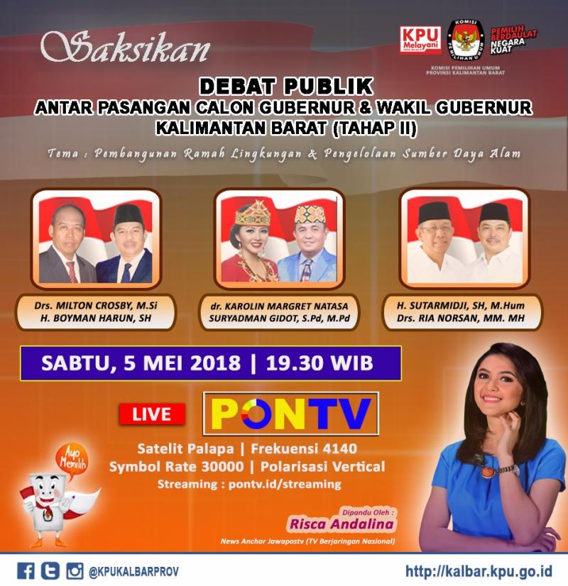 kalbar.kpu.go.id - Untuk terus berupaya menyampaikan informasi Visi dan Misi pasangan calon Gubernur dan Wakil Gubernur dalam Pemilihan Gubernur dan Wakil Gubernur Kalimantan Barat Tahun 2018, Komisi Pemilihan Umum (KPU) Provinsi Kalimantan Barat menggelar Debat Publik Antar Pasangan Calon Tahap II secara langsung di televisi lokal PonTV bertempat di Qubu Resort, Kubu Raya, Sabtu(05/05).