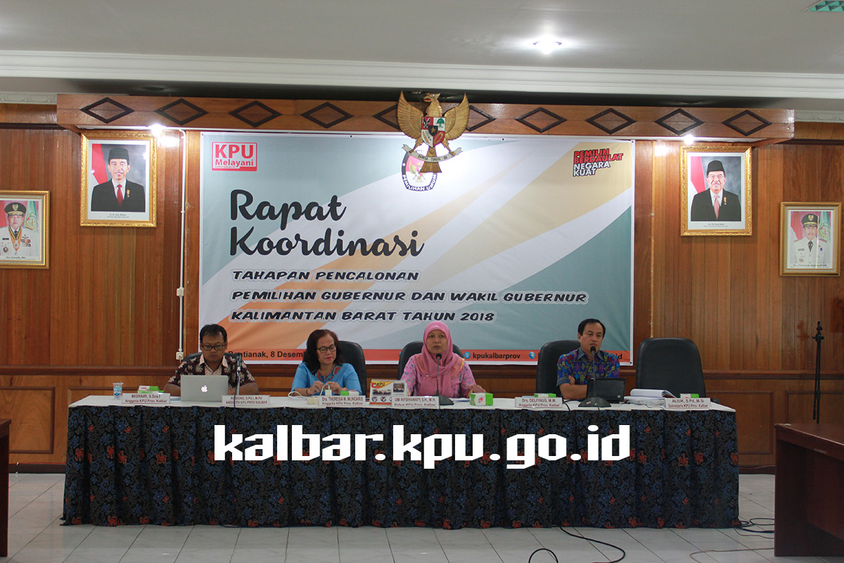 kalbar.kpu.go.id - Pontianak, Komisi Pemilihan Umum (KPU) Provinsi Kalimantan Barat menggelar Rapat Koordinasi Tahapan Pencalonan Pemilihan Gubernur dan Wakil Gubernur Kalimantan Barat Tahun 2018, Jumat(06/12).