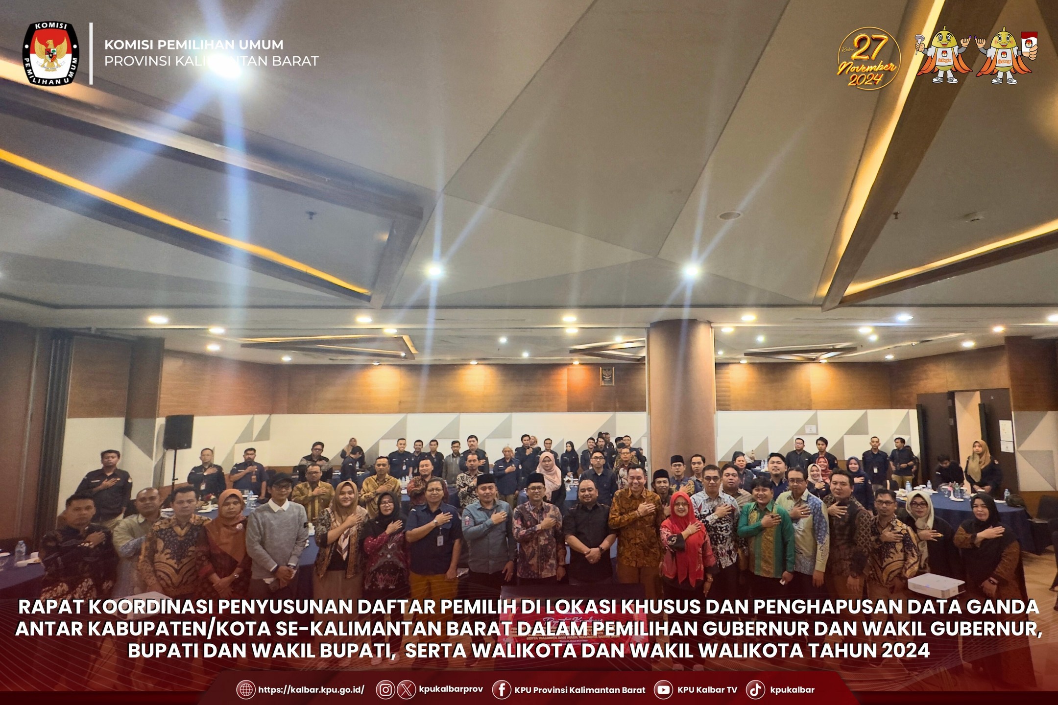 kalbar.kpu.go.id - Pontianak, KPU Kalbar melaksanakan Rapat Koordinasi Penyusunan Daftar Pemilih di Lokasi Khusus dan Penghapusan Data Ganda Antarkabupaten/kota se-Kalimantan Barat dalam Pemilihan Gubernur dan Wakil Gubernur, Bupati dan Wakil Bupati, Serta Walikota dan Wakil Walikota Tahun 2024, di Hotel Golden Tulip Pontianak, Selasa-Kamis (23-25/7).