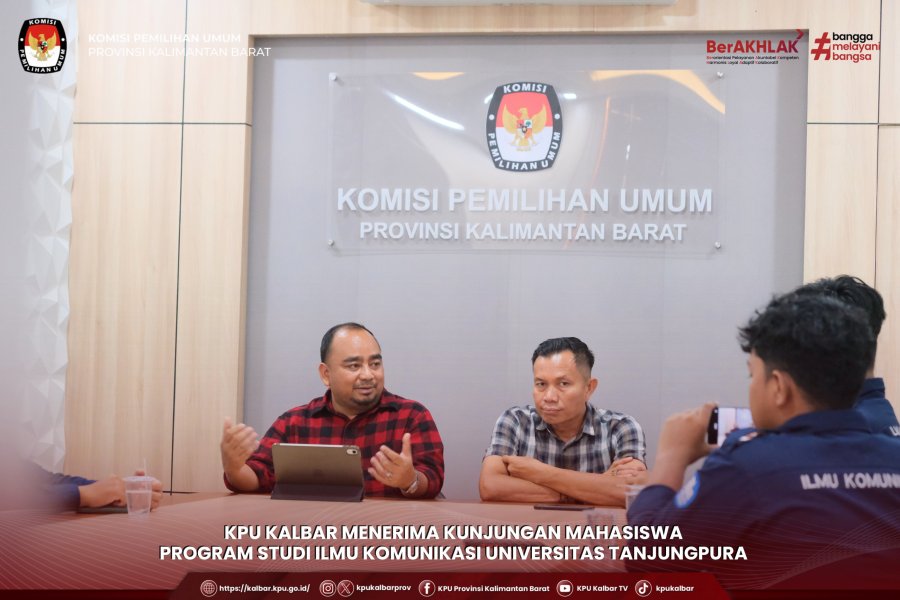kalbar.kpu.go.id - Pontianak, Komisi Pemilihan Umum (KPU) Kalimantan Barat menerima kunjungan dari mahasiswa Program Studi Ilmu Komunikasi Universitas Tanjungpura, bertempat di ruang rapat KPU Kalbar, Kamis (15/5). Kunjungan tersebut disambut langsung oleh Ketua KPU Kalbar Muhammad Syarifuddin Budi serta Ketua Divisi Sosialisasi Pendidikan Pemilih, Partisipasi Masyarakat, dan Sumber Daya Manusia KPU Kalbar Kartono Nuryadi. Dalam pertemuan ini, para mahasiswa berdiskusi seputar pendekatan strategi komunikasi yang diterapkan serta tantangan yang dihadapi dalam pelaksanaan fungsi kehumasan di lingkungan KPU Kalbar. (adm)