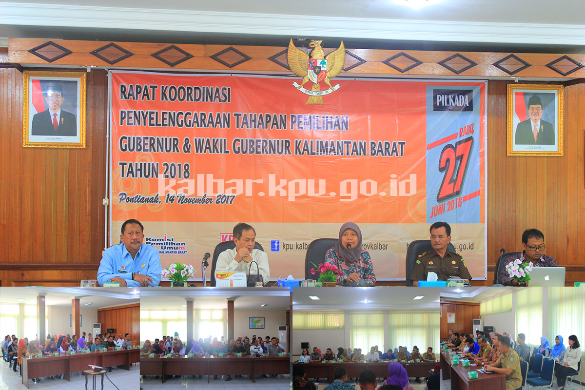 kalbar.kpu.go.id - Pontianak, Komisi Pemilihan Umum (KPU) Provinsi Kalimantan Barat menggelar Rapat Koordinasi Penyelenggaraan Tahapan Pemilihan Gubernur dan Wakil Gubernur Kalimantan Barat Tahun 2018, Selasa(14/11) bertempat di Aula Lt.2 KPU Provinsi Kalimantan Barat Jl. Subarkah No. 1 Pontianak Selatan.