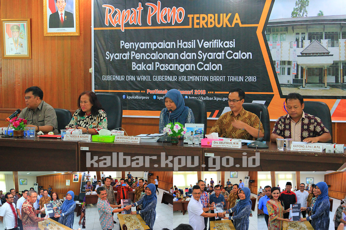 kalbar.kpu.go.id - Pontianak, Komisi Pemilihan Umum (KPU) Provinsi Kalimantan Barat menggelar Rapat Pleno Terbuka Penyampaian hasil Verifikasi Syarat Pencalonan dan Syarat Calon Bakal Pasangan Calon, Rabu(17/01), bertempat di Aula Lt.2 KPU Provinsi Kalimantan Barat Jl. Subarkah No. 1 Pontianak.