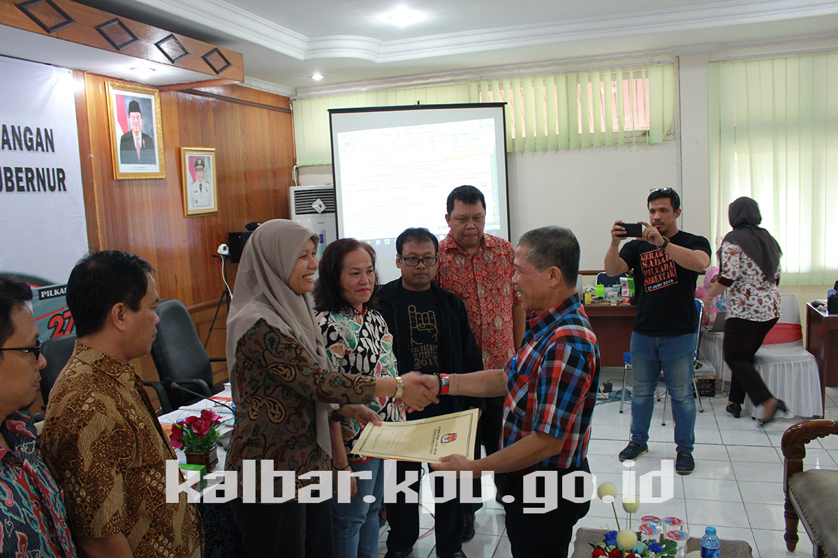 kalbar.kpu.go.id - Pontianak, Komisi Pemilihan Umum (KPU) Provinsi Kalimantan Barat serahkan hasil verifikasi administrasi terhadap dukungan bakal pasangan calon (Bapaslon) Perseorangan Kartius, S.H., M.Si. dan H. Pensong, S.E., M.Si. pada Pemilihan Gubernur dan Wakil Gubernur Kalimantan Barat Tahun 2018, Rabu(06/12).