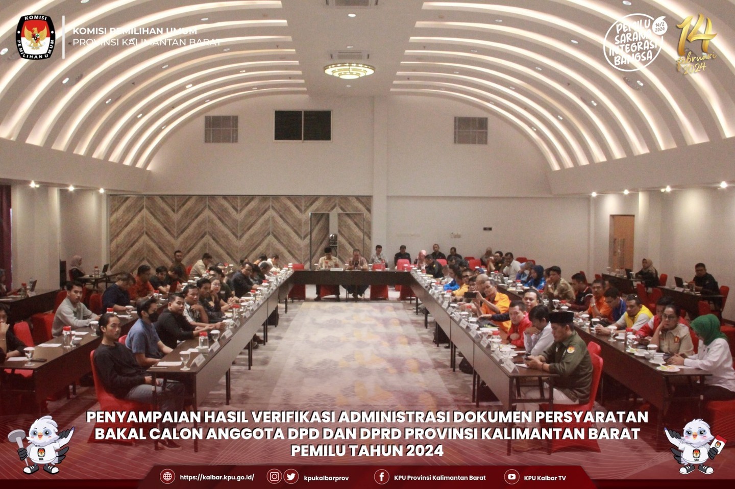 kalbar.kpu.go.id - Setelah melaksanakan seluruh kegiatan verifikasi administrasi (vermin) dokumen persyaratan bakal calon (balon) DPD dan DPRD Provinsi Kalbar berdasarkan jadwal dan tahapan, Sabtu(24/06) KPU Kalbar gelar kegiatan Penyampaian Hasil Verifikasi Administrasi Dokumen Persyaratan Bakal Calon Anggota DPD dan DPRD Provinsi Kalimantan Barat Pemilu Tahun 2024, bertempat di Hotel Mercure Pontianak.