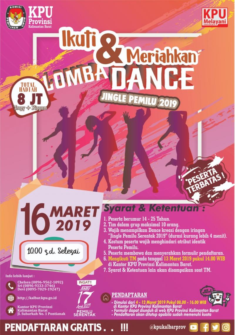 kalbar.kpu.go.id - Berikut disampaikan Pengumuman Lomba Dance Jingle Pemilu 2019 yang akan dilaksanakan pada 16 Maret 2019.