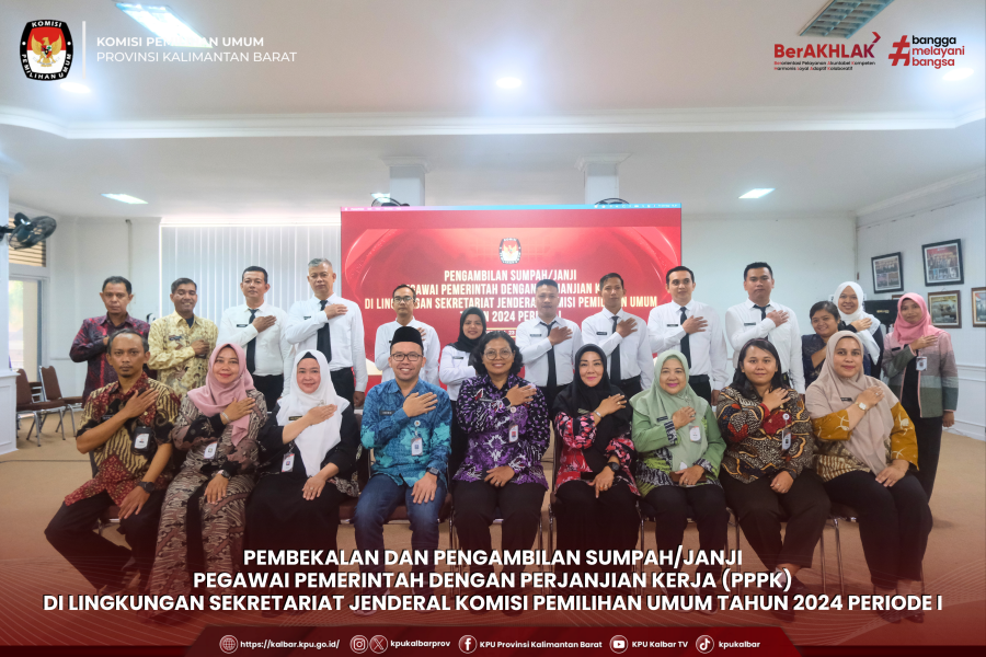 kalbar.kpu.go.id - Pontianak, KPU Kalbar mengikuti kegiatan Pembekalan dan Pengambilan Sumpah/Janji Pegawai Pemerintah Dengan Perjanjian Kerja (PPPK) Di Lingkungan Sekretariat Jenderal Komisi Pemilihan Umum Tahun 2024 Periode I secara daring, Jum'at (23/5). Pengambilan sumpah/janji dilakukan serentak secara virtual, dengan pelaksanaan di kantor Sekretariat Jenderal KPU RI dan diikuti seluruh PPPK secara daring. Dalam sambutannya, Sekretaris Jenderal KPU RI Bernad Dermawan Sutrisno, menekankan bahwa perubahan status menjadi PPPK tidak memengaruhi tugas dan fungsi utama yang selama ini dijalankan. Pegawai tetap menjalankan peran serta tanggung jawab sesuai kebutuhan dan struktur organisasi di satuan kerja masing-masing. Sebanyak 6 orang PPPK telah resmi dilantik dan akan menjalankan tugasnya di Sekretariat KPU Provinsi Kalimantan Barat. (adm)