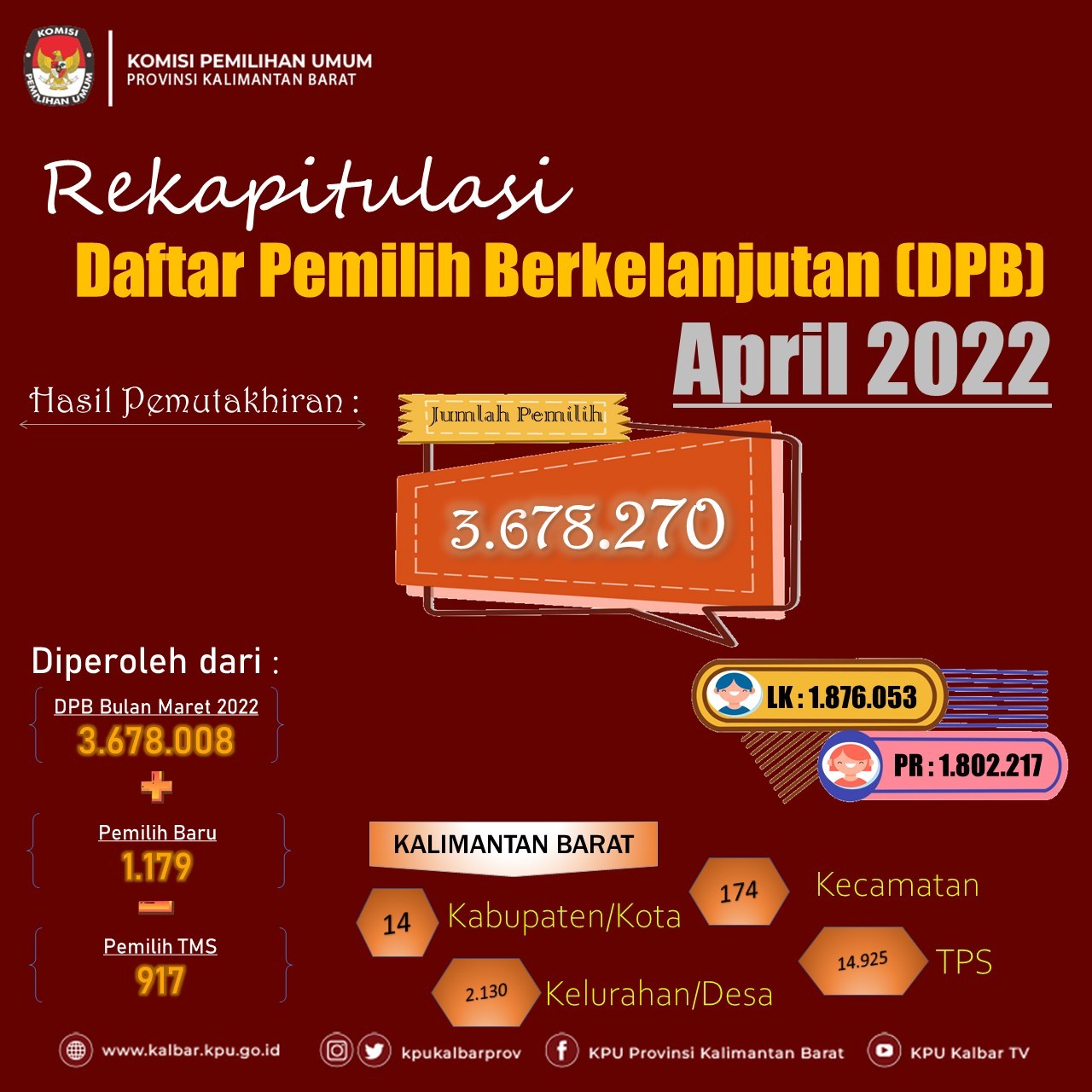 Berikut disampaikan hasil Pemutakhiran Daftar Pemilih Berkelanjutan di Provinsi Kalimantan Barat Bulan April 2022