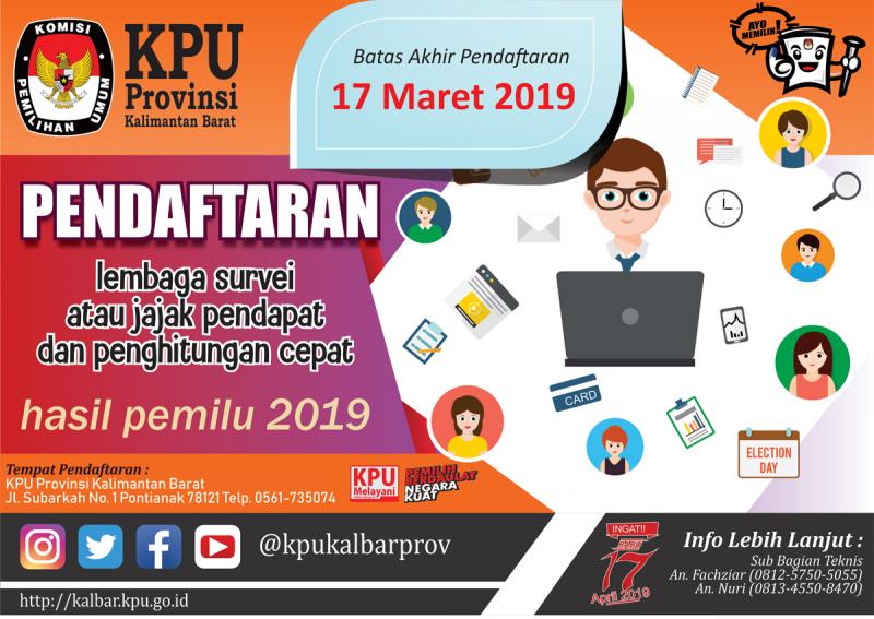 kalbar.kpu.go.id - Pontianak, Diumumkan pendaftaran Lembaga Survey atau Jajak Pendapat serta Penghitungan Cepat Hasil Pemilihan Umum Tahun 2019