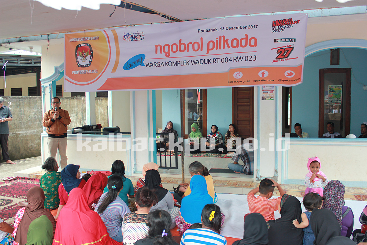 Anggota KPU Provinsi Divisi Sosialisasi Misrawi mengungkapkan bahwa dalam rangka peningkatan partisipasi masyarakat dalam pemilihan, KPU saat ini berusaha untuk memperluas sasaran sosialisasi sekaligus pendidikan pemilih saat memberikan sambutan pada kegiatan Sosialisasi dengan tema Ngobrol Pilkada Bareng Warga RT 04 RW 023 Waduk Kota Pontianak, Rabu(13/12).