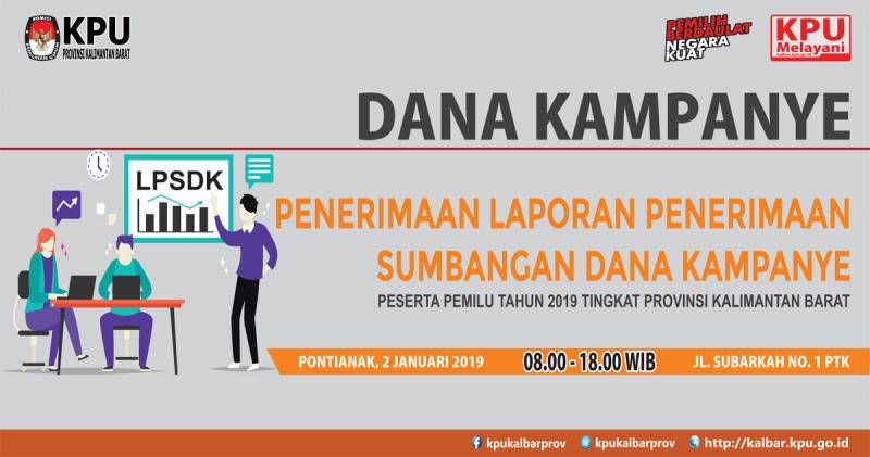kalbar.kpu.go.id - Tahapan Penyampaian LPSDK (Laporan Penerimaan Sumbangan Dana Kampanye) Peserta Pemilihan Umum Tahun 2019 tingkat Provinsi Kalimantan Barat, tanggal 2 Januari 2019 pukul 08.00 s.d. 18.00 WIB di Sekretariat KPU Provinsi Kalimantan Barat Jalan Subarkah No. 1 Pontianak.