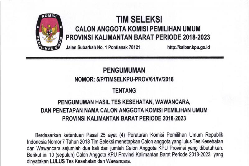 kalbar.kpu.go.id - Berikut disampaikan Pengumuman Hasil Tes Kesehatan, Wawancara, dan Penetapan Nama Calon Anggota Komisi Pemilihan Umum Provinsi Kalimantan Barat Periode 2018 - 2023.