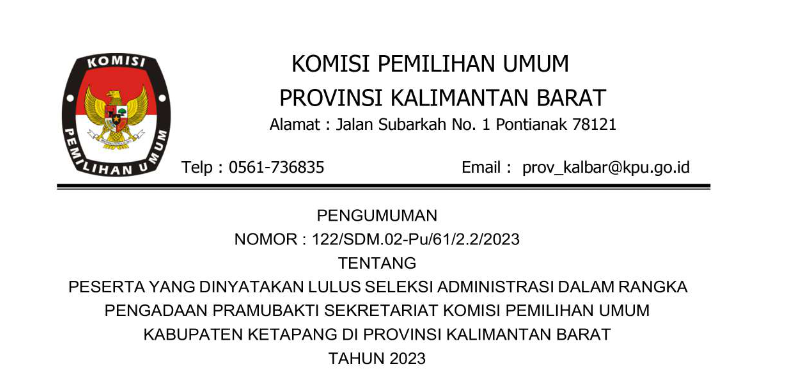 kalbar.kpu.go.id - Berikut disampaikan Pengumuman Nomor 122 Tahun 2023 Hasil Penelitian Administrasi Pramubakti Non ASN KPU Kabupaten Ketapang.