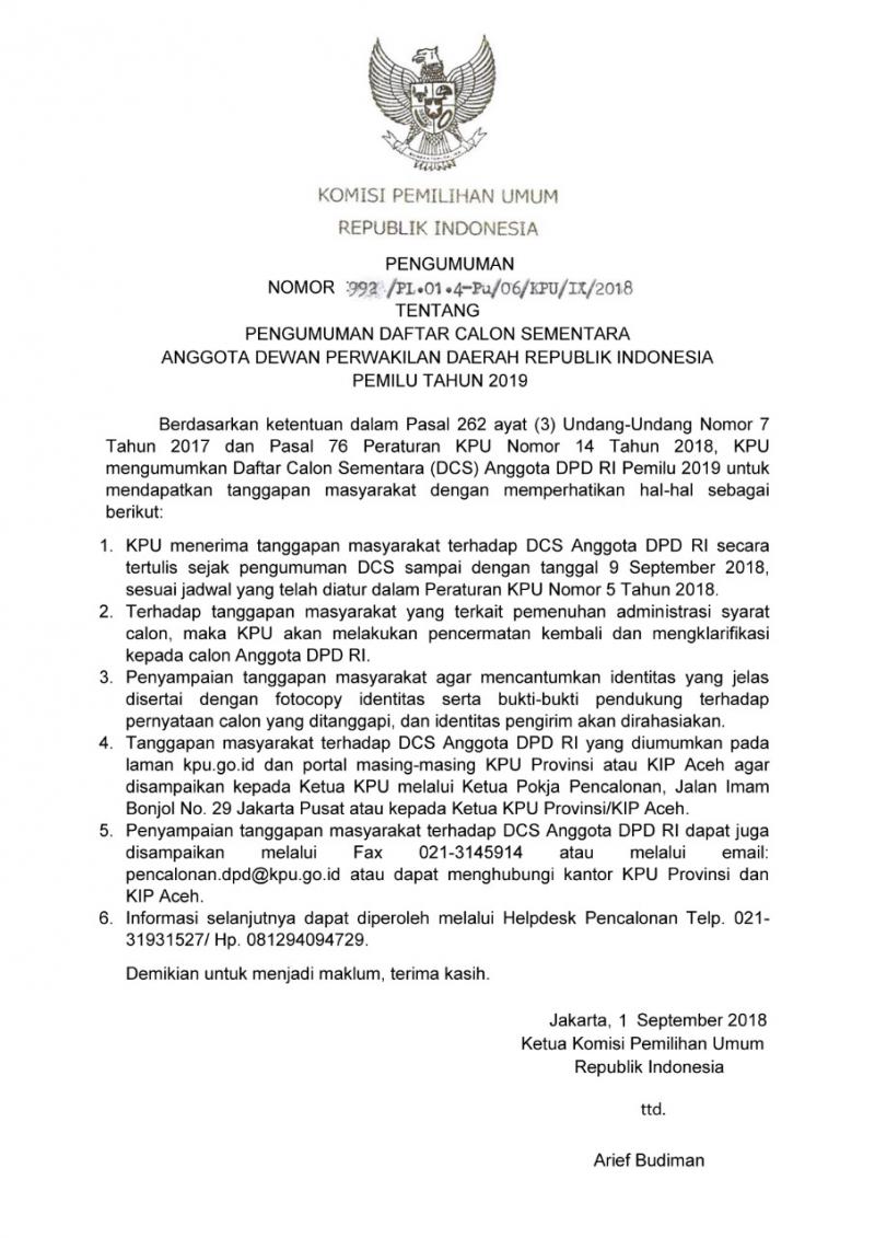 kalbar.kpu.go.id - Berikut disampaikan Pengumuman Nomor 992/PL.01.4-Pu/06/KPU/IX/2018 tentang Pengumuman Daftar Calon Sementara Anggota Dewan Perwakilan Daerah Republik Indonesia Pemilu Tahun 2019.