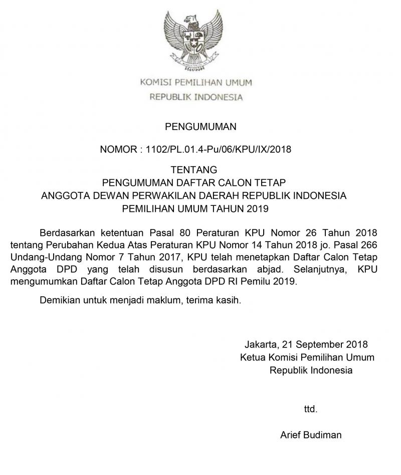 kalbar.kpu.go.id - Berikut disampaikan Pengumuman tentang Pengumuman Daftar Calon Tetap Anggota Dewan Perwakilan Daerah Republik Indonesia Pemilu Tahun 2019