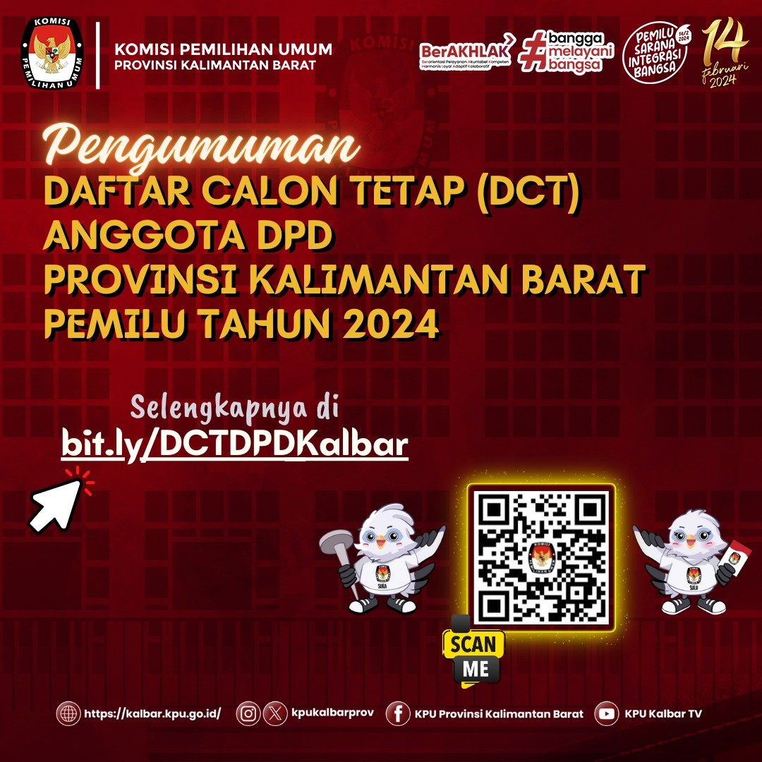 Berdasarkan ketentuan pasal 183 Peraturan Komisi Pemilihan Umum Nomor 10 Tahun 2022 tentang Pencalonan Perseorangan Peserta Pemilihan Umum Anggota Dewan Perwakilan Daerah, KPU Provinsi Kalimantan Barat mengumumkan Daftar Calon Tetap (DCT) Anggota Dewan Perwakilan Daerah Provinsi Kalimantan Barat. sebagaimana terlampir link dibawah ini.