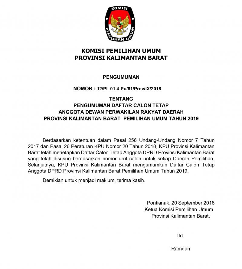 Pengumuman DCT Anggota DPRD Kalbar Pemilu 2019