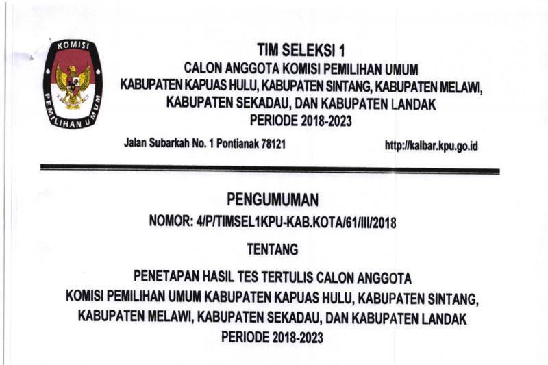 kalbar.kpu.go.id - Pontianak, Berikut disampaikan Pengumuman tentang Penetapan Hasil Tes Tertulis Calon Anggota KPU Kabupaten/Kota di Provinsi Kalimantan Barat Periode 2018 - 2023.