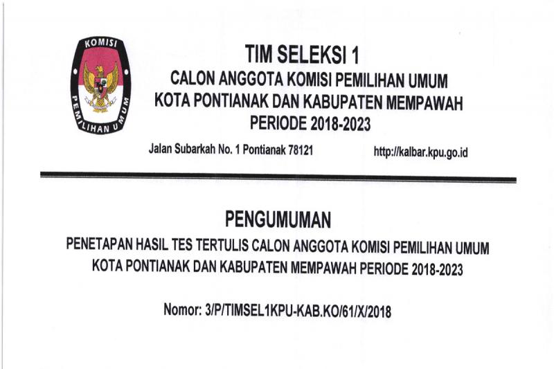 kalbar.kpu.go.id - Berikut disampaikan Pengumuman Penetapan Calon Anggota KPU Kota Pontianak dan Kabupaten Mempawah Periode 2018-2023 yang Lulus Penelitian Tertulis dengan Metode CAT.