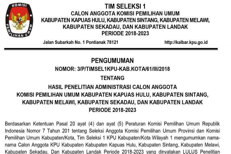 kalbar.kpu.go.id - Berikut disampaikan Pengumuman Hasil Penelitian Administrasi Calon Anggota KPU kabupaten/Kota Provinsi Kalimantan Barat Periode Tahun 2018 - 2023.