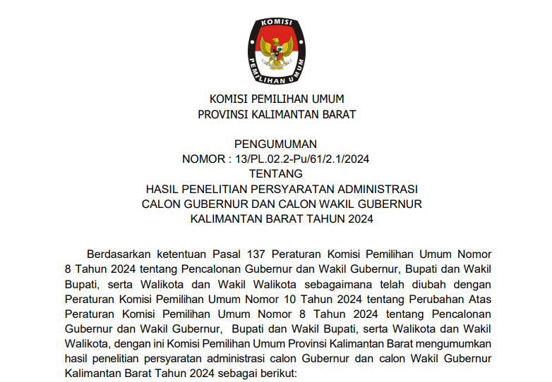kalbar.kpu.go.id - Pontianak, Berdasarkan ketentuan Pasal 137 Peraturan Komisi Pemilihan Umum Nomor 8 Tahun 2024 tentang Pencalonan Gubernur dan Wakil Gubernur, Bupati dan Wakil Bupati, serta Walikota dan Wakil Walikota sebagaimana telah diubah dengan Peraturan Komisi Pemilihan Umum Nomor 10 Tahun 2024 tentang Perubahan Atas Peraturan Komisi Pemilihan Umum Nomor 8 Tahun 2024 tentang Pencalonan Gubernur dan Wakil Gubernur, Bupati dan Wakil Bupati, serta Walikota dan Wakil Walikota, dengan ini Komisi Pemilihan Umum Provinsi Kalimantan Barat mengumumkan hasil penelitian persyaratan administrasi calon Gubernur dan calon Wakil Gubernur Kalimantan Barat Tahun 2024 .....