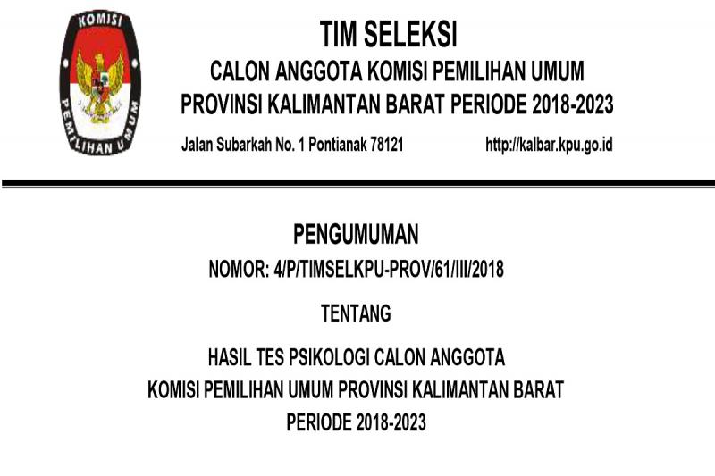kalbar.kpu.go.id - Berikut disampaikan Pengumuman Hasil Tes Psikologi Calon Anggota KPU Provinsi Kalimantan Barat Periode Tahun 2018 - 2023.