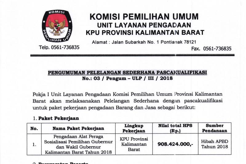 kalbar.kpu.go.id - Berikut disampaikan Pengumuman Pelelangan Sederhana Pascakualifikasi Pengadaan Alat Peraga Sosialisasi Pemilihan Gubernur dan Wakil Gubernur Kalimantan Barat Tahun 2018.