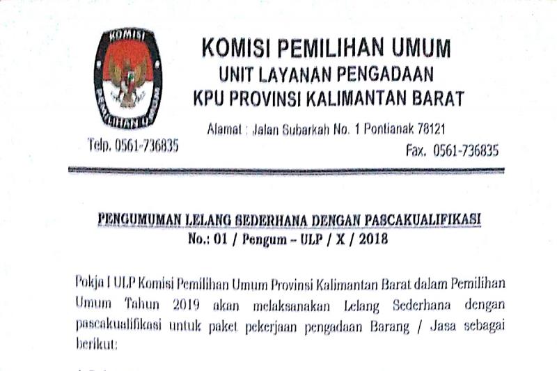 kalbar.kpu.go.id - Berikut disampaikan Pengumuman Lelang Sederhana Pengadaan APK Pemilihan Umum Tahun 2019 KPU Kabupaten Ketapang.