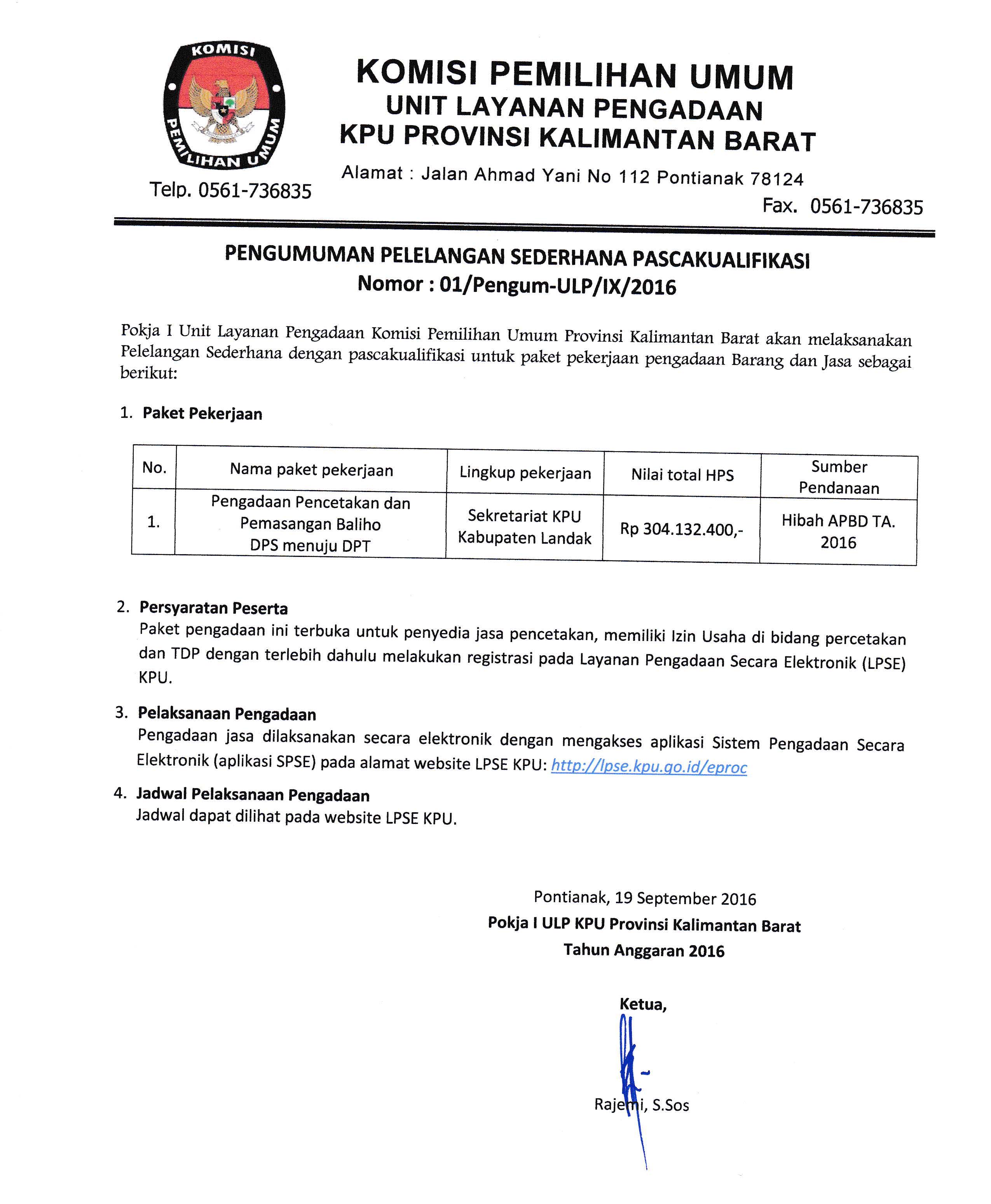 Pengumuman Pelelangan Sederhana PascaKualifikasi Nomor : 01/Pengum-ULP/IX/2016
