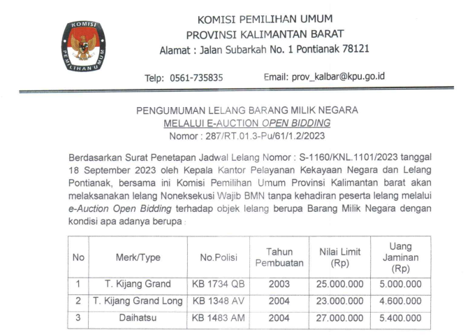 kalbar.kpu.go.id - Berikut disampaikan Pengumuman Lelang Barang Milik Negara melalui e-Auction Open Bidding.