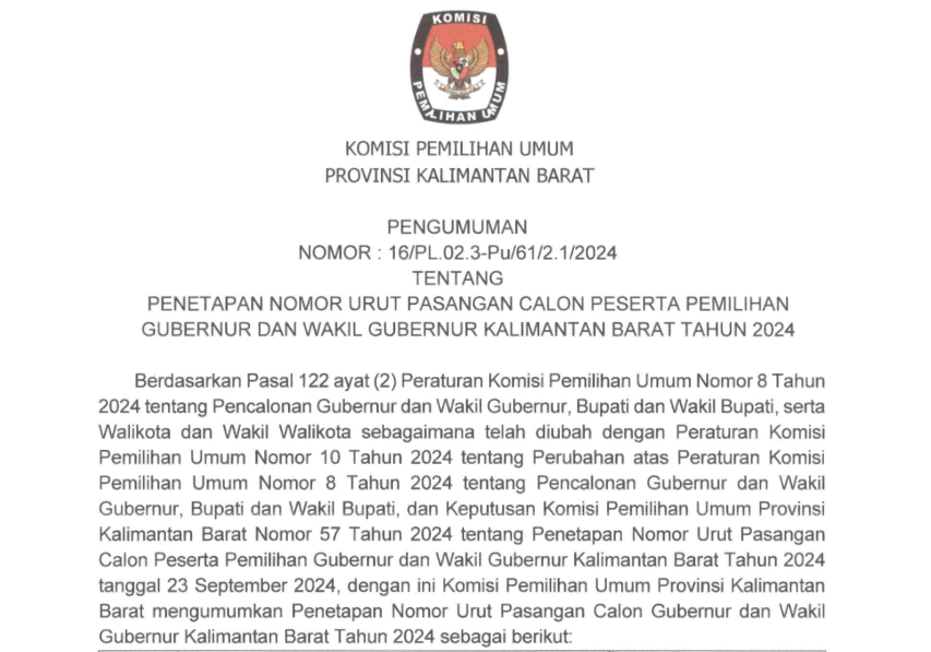 kalbar.kpu.go.id - Pontianak, Berikut disampaikan Pengumuman KPU Kalbar Nomor 16 Tahun 2024 tentang Penetapan Nomor Urut Pasangan Calon Peserta Pemilihan Gubernur dan Wakil Gubernur Kalimantan Barat Tahun 2024.