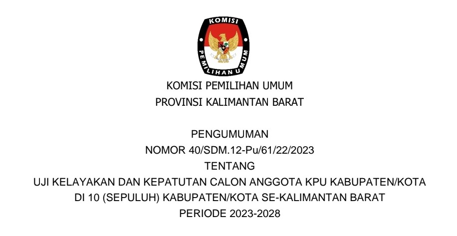 kalbar.kpu.go.id - Berikut disampaikan Pengumuman No 40 Tahun 2023 tentang Uji Kelayakan dan Kepatutan Calon Anggota 10 KPU Kabupaten/Kota Periode 2023 - 2028.