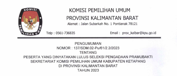 kalbar.kpu.go.id - Pengumuman Nomor 137 Tahun 2023 tentang Peserta Yang Dinyatakan Lulus Seleksi Pengadaan Pramubakti Sekretariat Komisi Pemilihan Umum Kabupaten Ketapang di Provinsi Kalimantan Barat Tahun 2023.