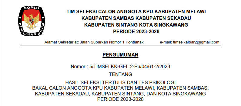kalbar.kpu.go.id - Pontianak, PENGUMUMAN Nomor : 5/TIMSELKK-GEL.2-Pu/04/61-2/2023 TENTANG HASIL SELEKSI TERTULIS DAN TES PSIKOLOGI BAKAL CALON ANGGOTA KPU KABUPATEN MELAWI, KABUPATEN SAMBAS, KABUPATEN SEKADAU, KABUPATEN SINTANG, DAN KOTA SINGKAWANG PERIODE 2023-2028.