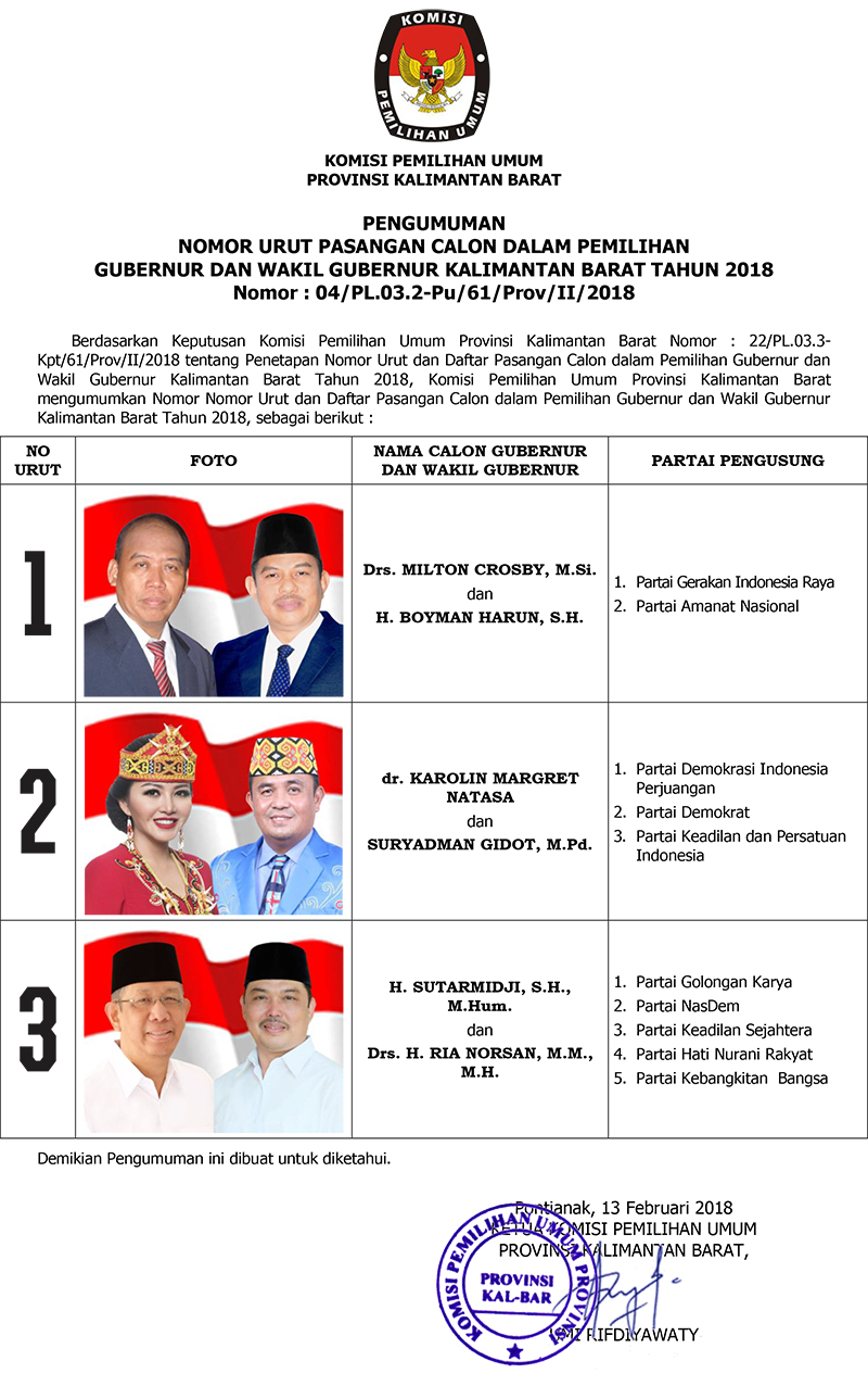 Pengumuman NoUrut Paslon Peserta Pilgub Kalbar 2018