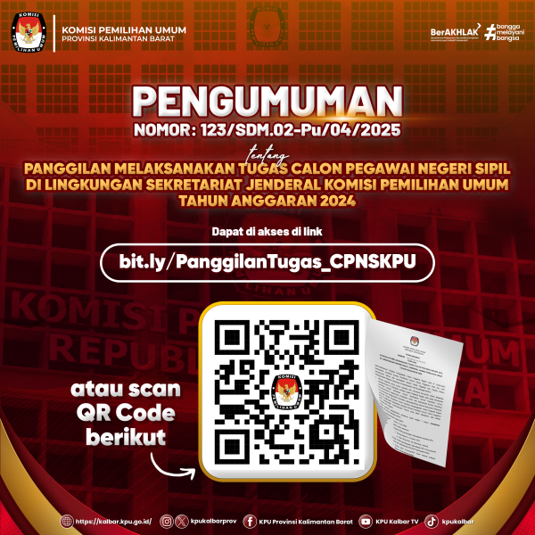 kalbar.kpu.go.id - Pontianak, Pengumuman Nomor: 123/SDM.02-Pu/04/2025 tentang Panggilan Melaksanakan Tugas Calon Pegawai Negeri Sipil Di Lingkungan Sekretariat Jenderal Komisi Pemilihan Umum Tahun Anggaran 2024