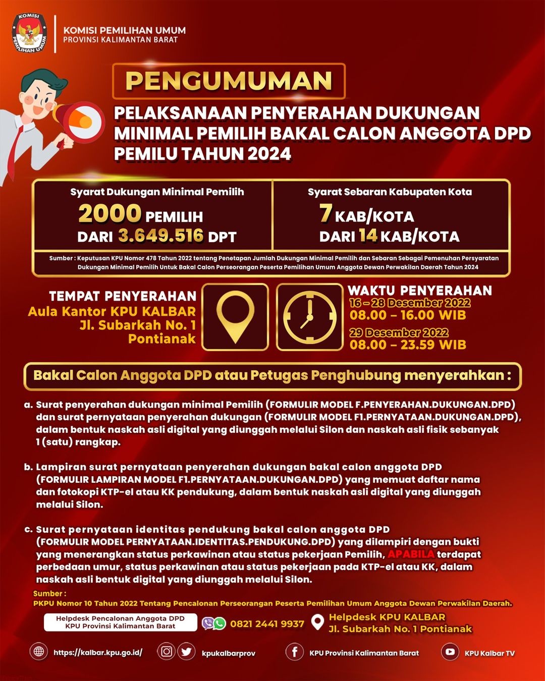 kalbar.kpu.go.id - Pontianak, Berikut disampaikan Pengumuman KPU Kalbar Nomor : 168 Tahun 2022 tentang Pelaksanaan Penyerahan Dukungan Minimal Pemilih Bakal Calon Anggota Dewan Perwakilan Daerah yaitu :