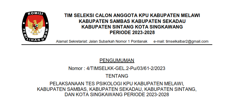 Pengumuman Pelaksanaan Tes Psikologi KPU Kabupaten Melawi, Kabupaten Sambas, Kabupaten Sekadau, Kabupaten Sintang, dan Kota Singkawang Periode 2023-2028